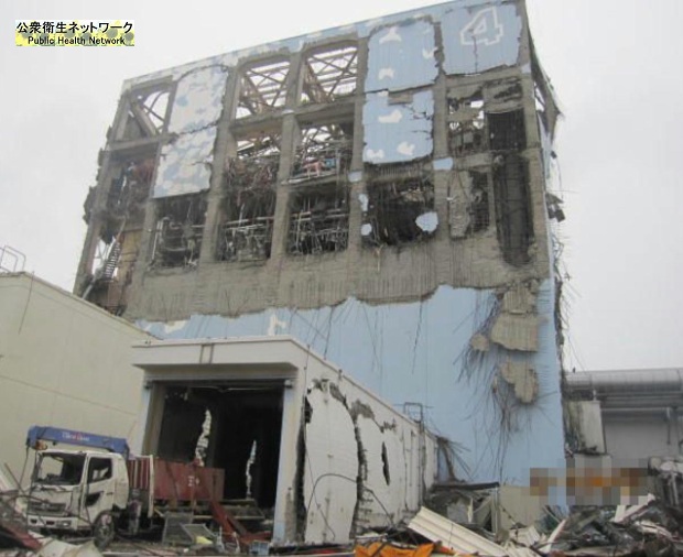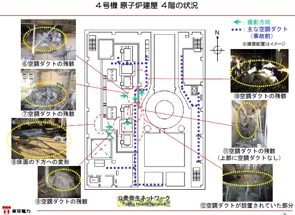 被災前、東京電力は何らかの目的で4号機原子炉に核燃料を挿入したが、被災により冷却機能を失った4号機原子炉で水素が発生し、水素は5階の空調ダクト吸気口から4階へ流れたようだ。そして4階にある機械の余熱や火花に引火して爆発したように見える。