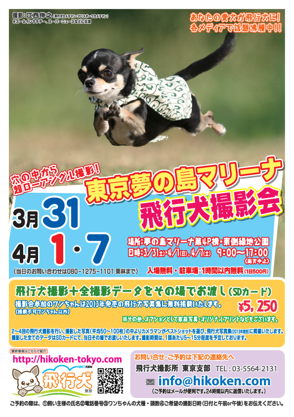 撮影会では、2~4回の飛行犬撮影を行い、撮影した写真(平均50~100枚)の中からカメラマンがベストショットを選び、2013年発売の飛行犬写真集に掲載されます。撮影した全てのデータはSDカードにて、当日その場でお渡し。撮影時間は1頭あたり5~15分程度を予定しております。