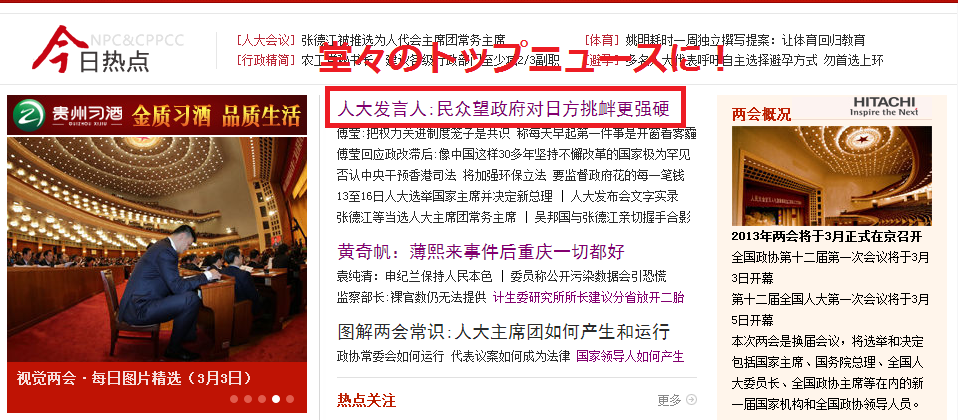 ですから全人代でこの問題が話されている時、共同通信の記者は日本の政界の人々、日本の有識者の人々に(そのことを伝えて欲しいと)希望しています。日本の人民、日本の指導者は中国人民の考え方を知っているか、釣魚島の歴史事実を知っているか、彼らは客観的に向き合えるのか、そのことを私たちは知りたいと思っています。