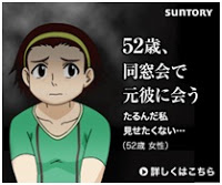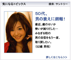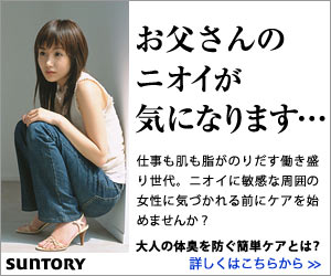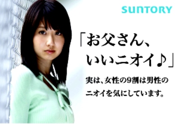 サントリーウエルネスは、いくつかの取り扱い商品について広告を出していて、その商品にはアンチ・エイジング、滋養強壮、体臭抑制などがあるようです。どの広告でも共通の設定があるようなので、ここではとくに区別はしていません。