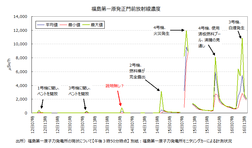 明らかに原発内の放射線濃度が上昇している。夜にはだいぶ放射線濃度が減少したが、まだ前日の水準までも戻っていない。ピーク時の12ミリシーベルトは、胸部X線2回分の放射線量と同等のようだ(asahi.com)が、長時間その場に留まるには危険な状態だ。距離の二乗に比例して粒子が拡散していくので、この値が周辺住民などへの脅威となるわけではないが、徐々に混迷が増しているのは確かなようだ。爆発事故自体は放射線濃度の上昇はもたらしていないのが興味深い。