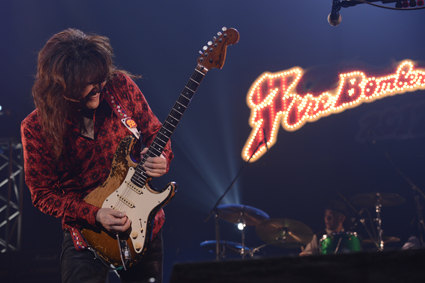 赤のシャツとデニムというカジュアルな衣装の福山だが、ギターは熱気バサラ・バージョン。キーボードがレイ・ラブロックと同じくショルキー(ショルダーキーボード)であることも、ファンを嬉しくさせる。