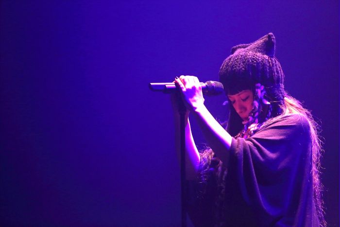 ロックの名曲のフレーズを織り交ぜたヘヴィなギターが出ばやしとなって、福山芳樹とチエカジウラがバンドメンバーとともにステージに登場。