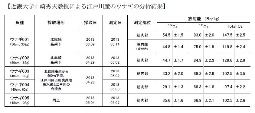 | 近畿大学山崎秀夫教授による江戸川産のうなぎの分析結果 |