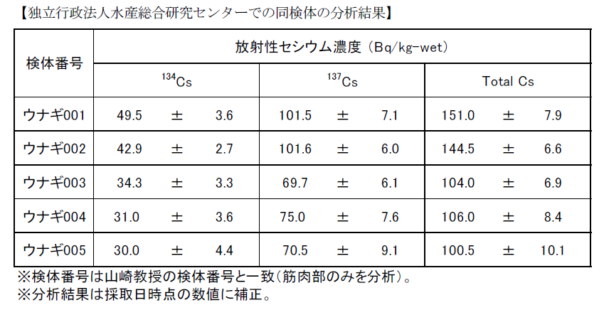 江戸川のうなぎの測定は、近畿大学山崎秀夫教授によるものと独立行政法人水産総合研究センターでの検体の分析結果が両方掲載されていました。分析結果のみ掲載します。