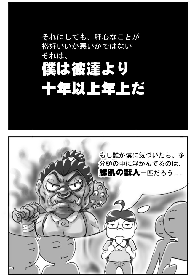 →例、「しかし、現実はー 誰も僕を新入生とは気が付かない・・・・・」