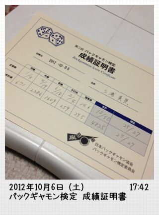 ちなみに検定料1000円、解説書3000円、認定証1000円。後ろの2つはオプションだけど、試験だけ受けて、解説読まない訳にもいかんし、認定証だって欲しいわさ。5000円はあまりに高すぎるだろ…検定料2000円で全部込みにするとか、あと、レベルを幾つか設定するとかさあ。やっぱJBLは、バックギャモンを普及させたくないとしか思えんです。