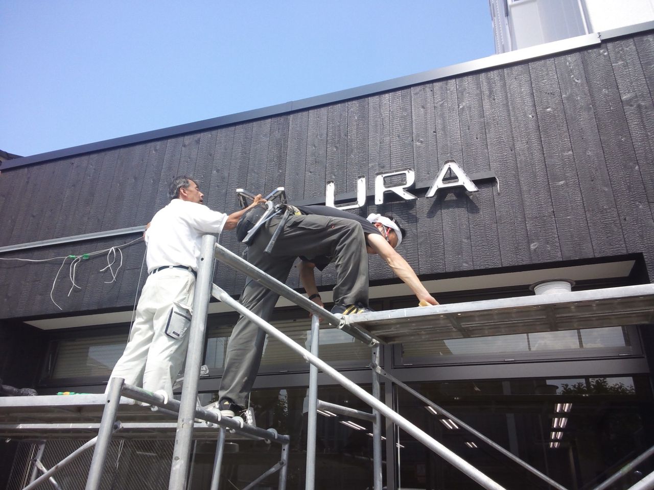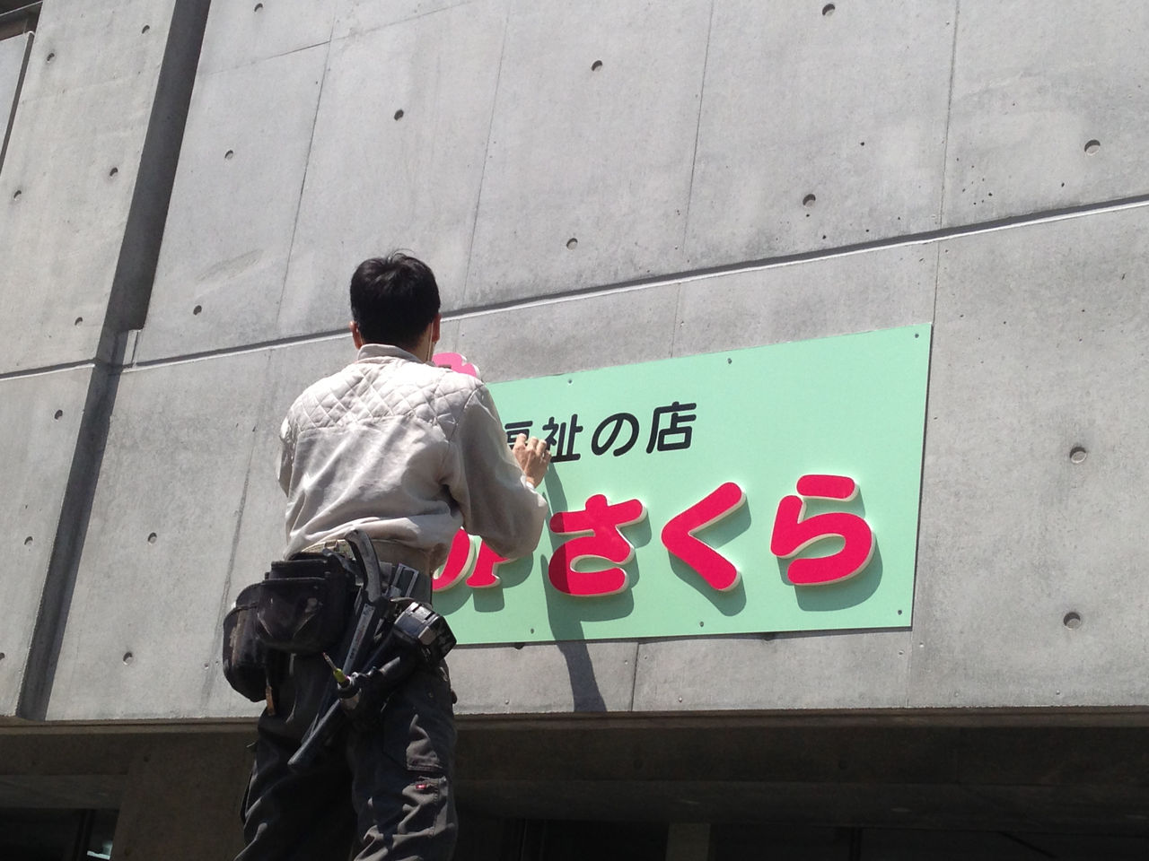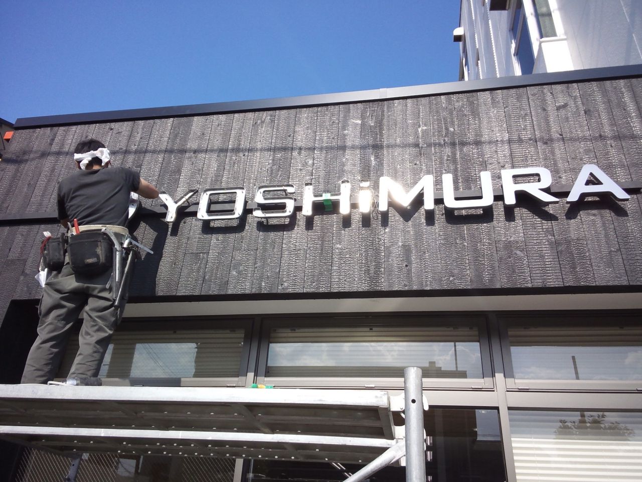今回の施工内容は、バックライトの箱文字と切り文字の取付、入り口のカッティングシートの3カ所です