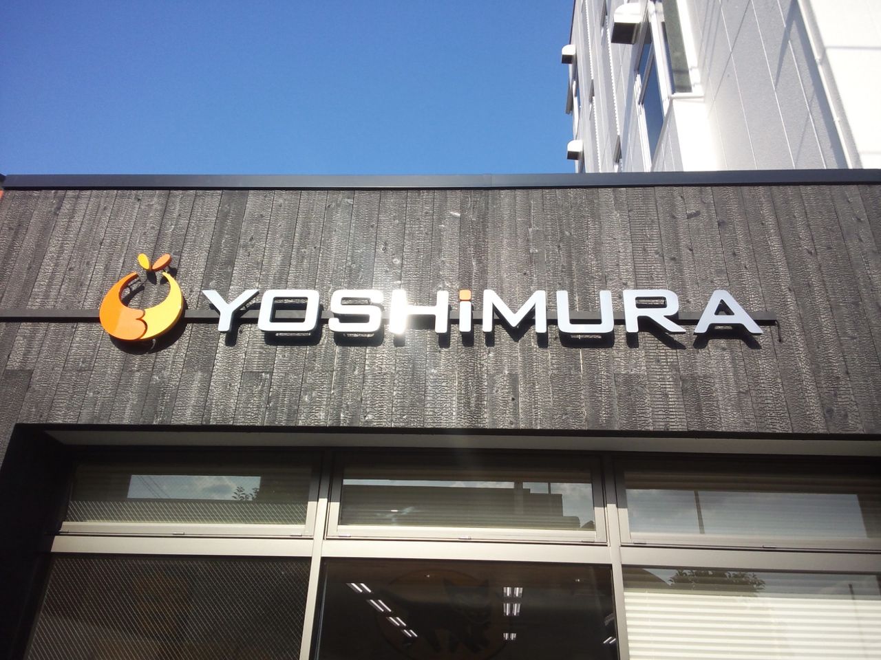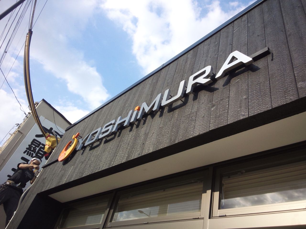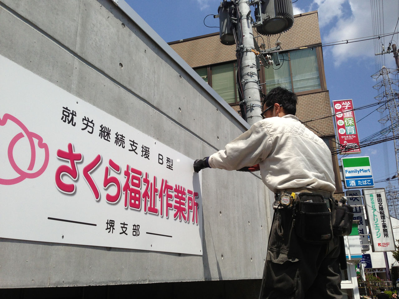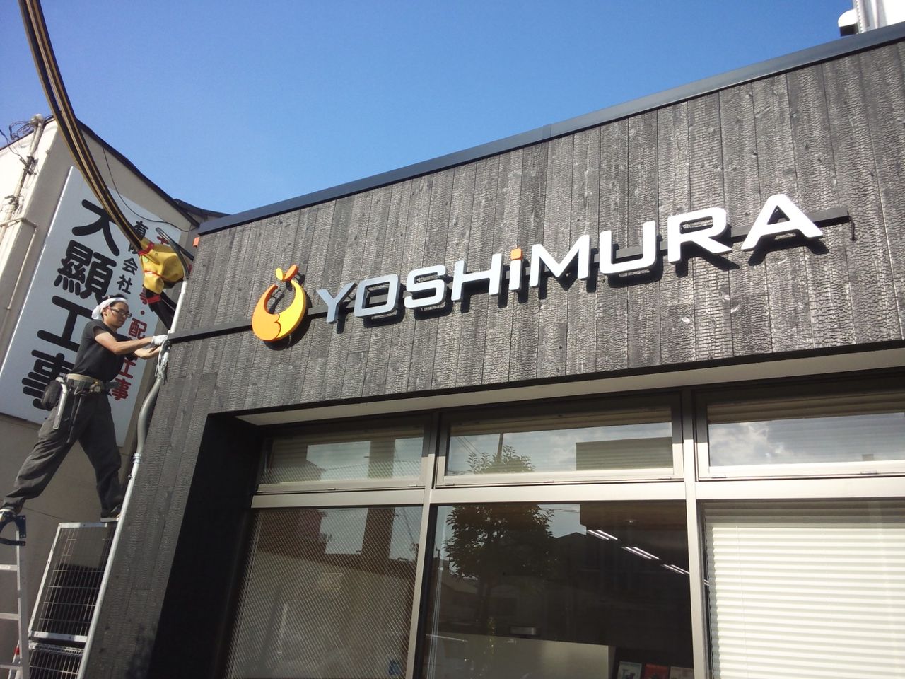 今回の施工内容は、バックライトの箱文字と切り文字の取付、入り口のカッティングシートの3カ所です
