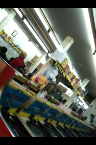 台は縦に3列あって、列ごとに見張り役みたいな人が上で座っています。棚の上には景品らしきものが置いてあります。↓