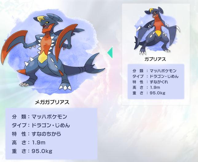 メガシンカすることで膨張した筋肉が示すように、こうげき・とくこうが大きな伸びを見せる一方で、すばやさはガブリアスのときよりも低くなる。