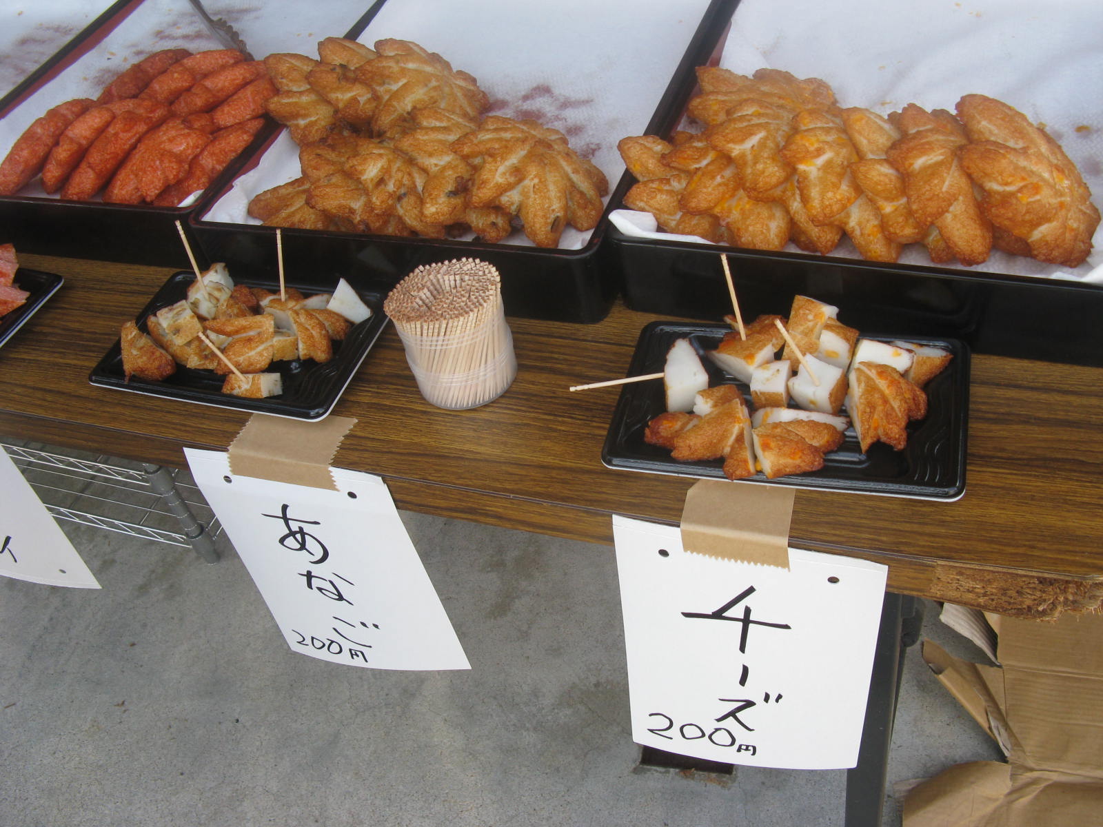 「もみじ天」で有名な草津の坂井屋さんの出店でした。坂井屋さんはもともと結婚式や法事などで使われる伝統的な「細工かまぼこ」で有名なお店でしたけど、今では「もみじ天」で超有名。