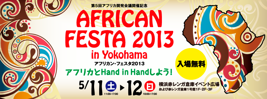 This year African Festa 2013 will be held at the Yokohama Red Brick Warehouse Event Square and the No.1 Building on May 11th and 12th in celebration of the 5th Tokyo International Conference on African Development (TICAD V) to be held in Yokohama on June 1st, 2nd and 3rd With the theme “Hand in Hand with Africa”.