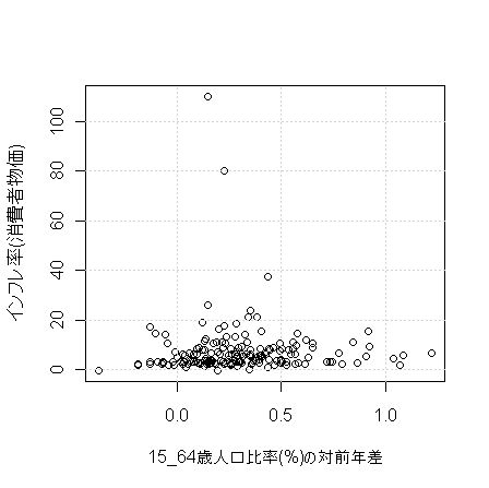 最後に、15-64歳人口比率の差分と物価上昇率の散布図です。相関係数は-0.0517.