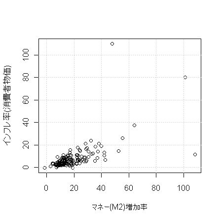 通貨・準通貨増加率と物価上昇率とで散布図をとると、以下のようになります。相関係数は+0.6213.