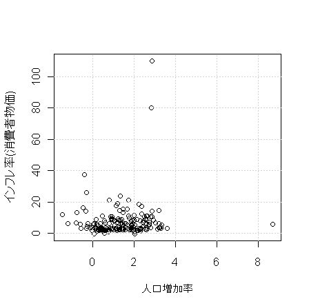 人口成長率と物価上昇率との散布図は以下の通りです。相関係数は+0.0719.
