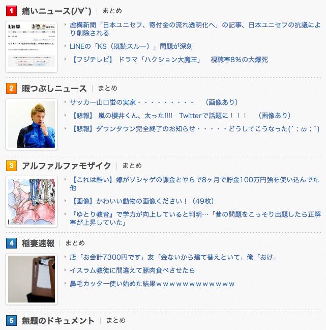 よく知られているように、livedoor Blogは2chまとめの市場をかっさらっています。痛いニュース、アルファルファモザイク、ハムスター速報、無題のドキュメント、はちま起稿、ゴールデンタイムズ、VIPPERな俺などなどなど、大手から弱小まで、もののみごとに2chまとめ=livedoor Blogという感じです。livedoor BlogはブログサービスのなかでトップクラスのPVを誇るそうですが、これには2chまとめが大きく寄与しているのでしょう。