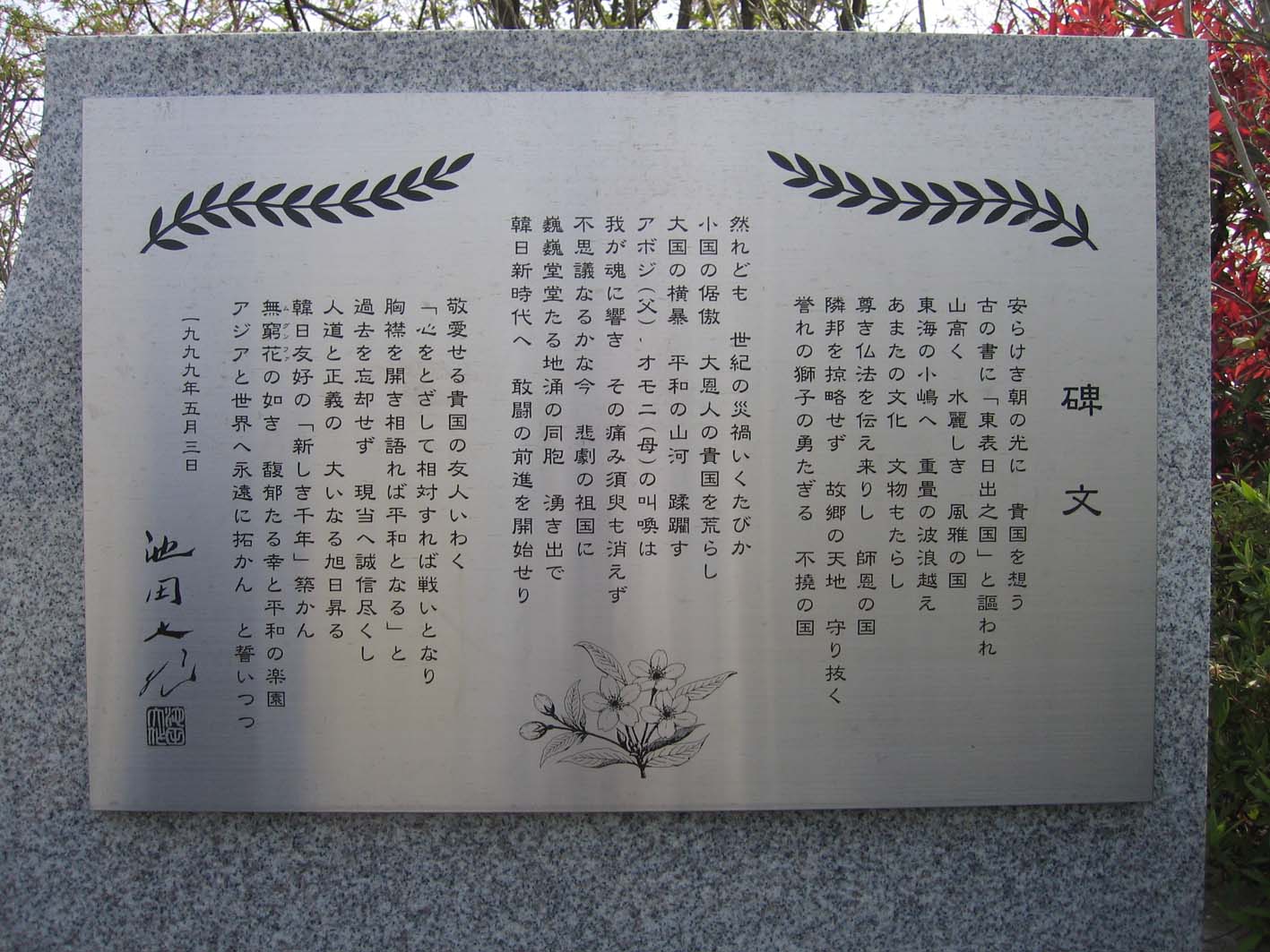 創価敷地内にある「池田大作 碑文 韓日新時代」