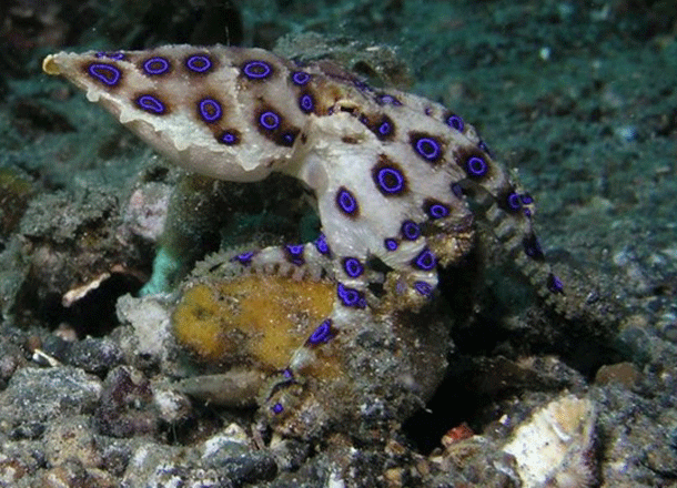 このタコの毒は非常に強く、フグの毒と同じテトロドトキシンが含んだ唾液を放出する。
