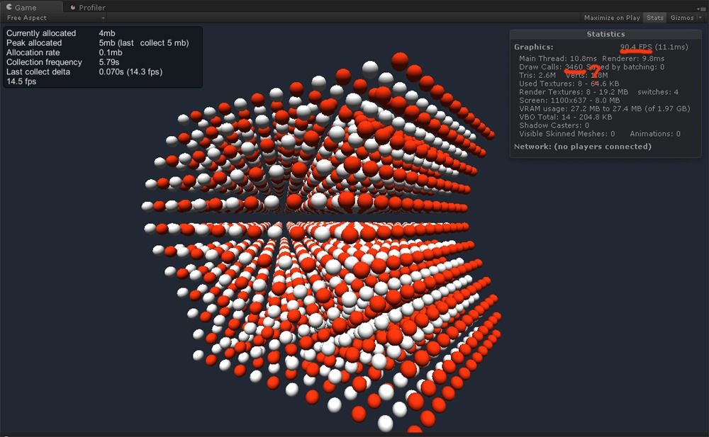 画像のStatisticsで表示されるDrawCall数は3000を越えていますが FPS値はふつうに高いままなので Unityの中身はわからないので想像ですが、おそらくCPU側でGraphics.Draw関数をコールした回数だと思われます。VRAMへの描画は1フレームで行われているらしいです。