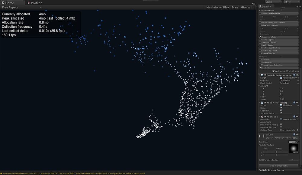 さらに大量にパーティクルを処理させたい場合は Perlinノイズ生成部分を3Dテクスチャ化またはハッシュテーブルを使用したものに置き換えたり、GPUシェーダやコンピュートシェーダの使用 などが有効そうです。