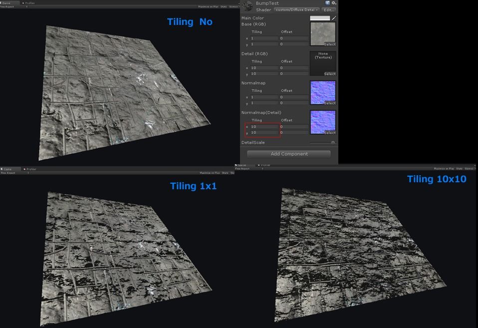 モデル全体を覆うノーマルマップとデティール用のノーマルマップそれぞれが あまり大きなテクスチャを使用しなくてもモデルのデティールアップが図れることが挙げられます。たとえば壁などで細かい質感を出すために高解像度テクスチャを使用しなくてもわりとラフなテクスチャでも十分見栄えのする質感表現が可能になります。