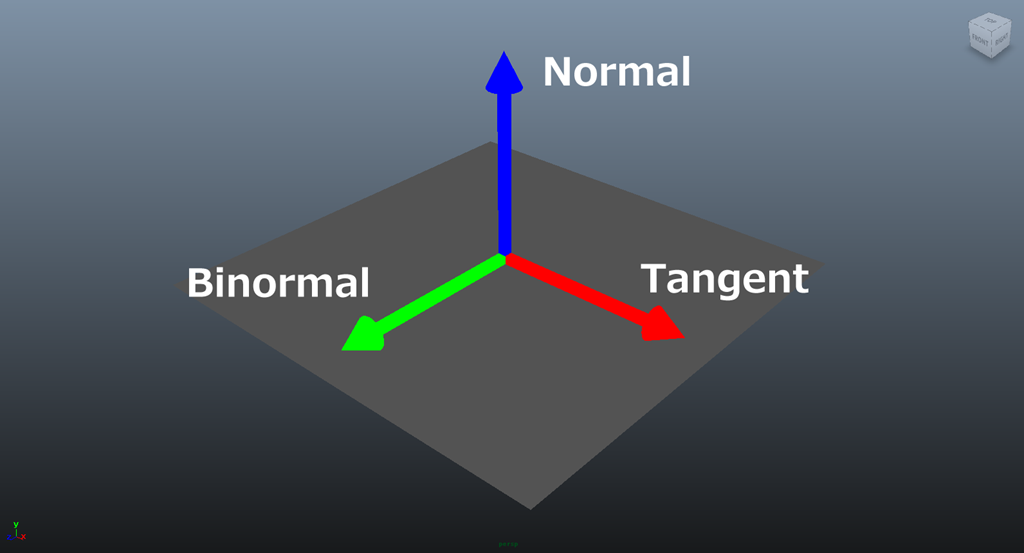 接空間 (Tangent Space) ポリゴン面の法線に対して垂直に接する面の座標空間です。グーローシェーディングがかかっている場合はポリゴン面上の法線はポリゴンを構成する頂点の法線がグラデーションで補完された値になります。
