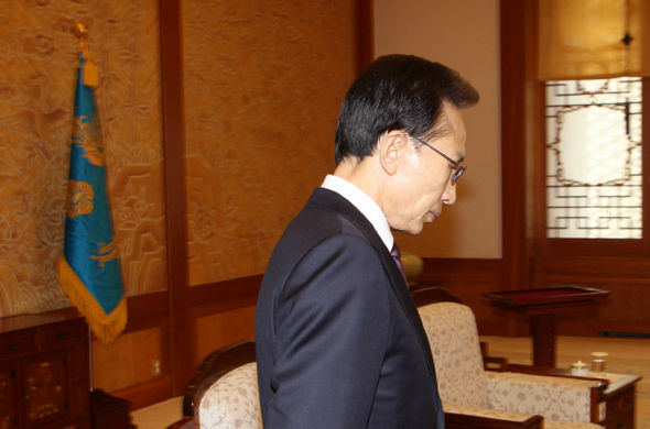 ←大統領府秘書官の指揮を受けた国務総理室公職倫理支援官室の無差別的な不法査察事実が明らかになる中で査察内容が李明博大統領に報告されたか否かが核心争点に浮上した。 写真は去る8日、大統領府で開かれたチェ・ヨンジン駐米大使信任状授与式場に入る李明博大統領の姿。 キム・ポンギュ記者 bong9@hani.co.kr
