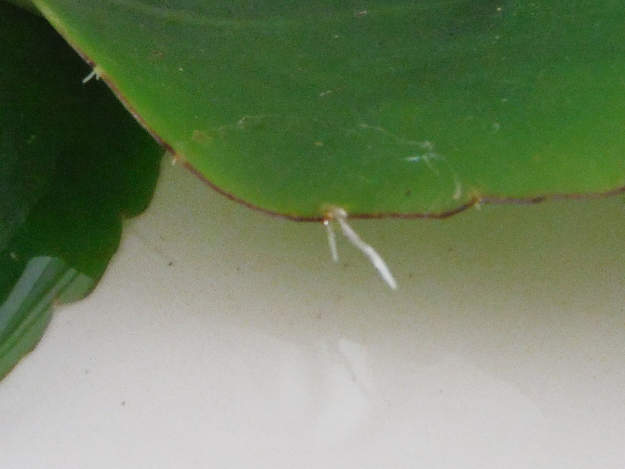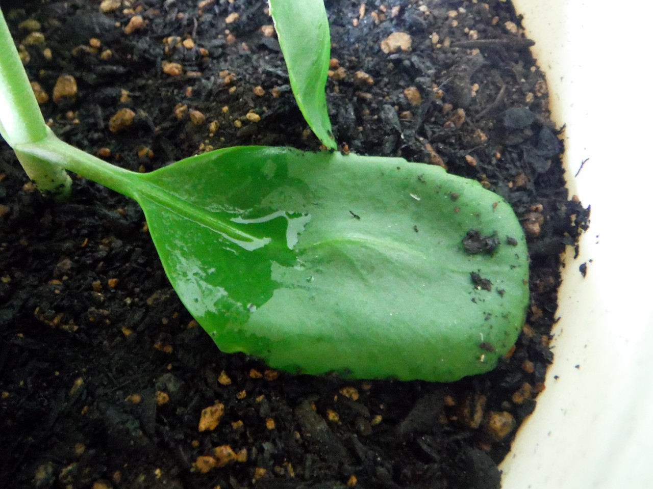 葉から新芽を発芽させる条件として、土壌の栄養素の欠落や、本体が枯れかかってるときなどがあるんだけれど、このように、葉が土と接することでも、発芽が促されるそうなので…まあ、いいか。このまま様子を見ることにします。