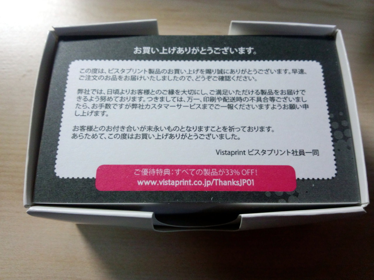 ただし、私自身も、VistaPrintとトラブルはあったんだ。とはいえ、これはVistaPrintの印刷所のミス。印刷中にインク切れを起こしたらしく、そのインク切れした状態の商品をそのまま送ってきたことがあったんだ。ただし、その旨サポートに連絡したところ、そうした印刷トラブルは把握していたが、誰に送ったのかが解っていなかったらしく、謝罪を受けた上で迅速に対応してもらっている。
