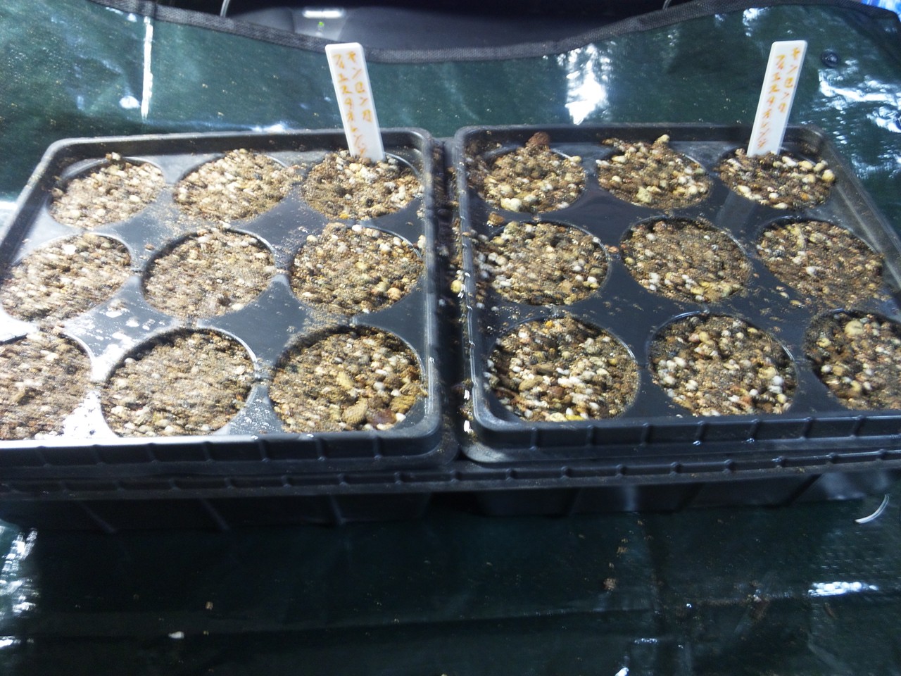 ともあれ、種を蒔いて、それぞれにネームプレートを取り付け、さらにメネデール希釈液で灌水させて、キンセンカの苗床が完成!