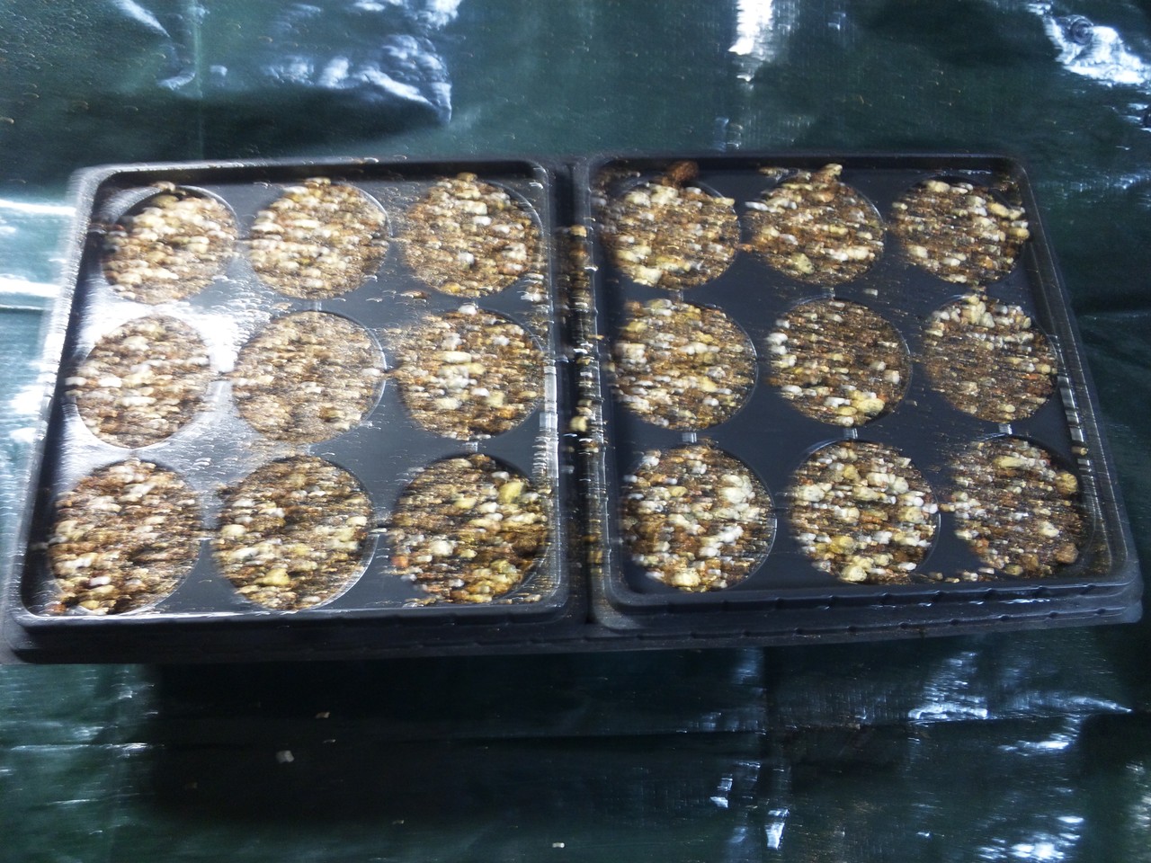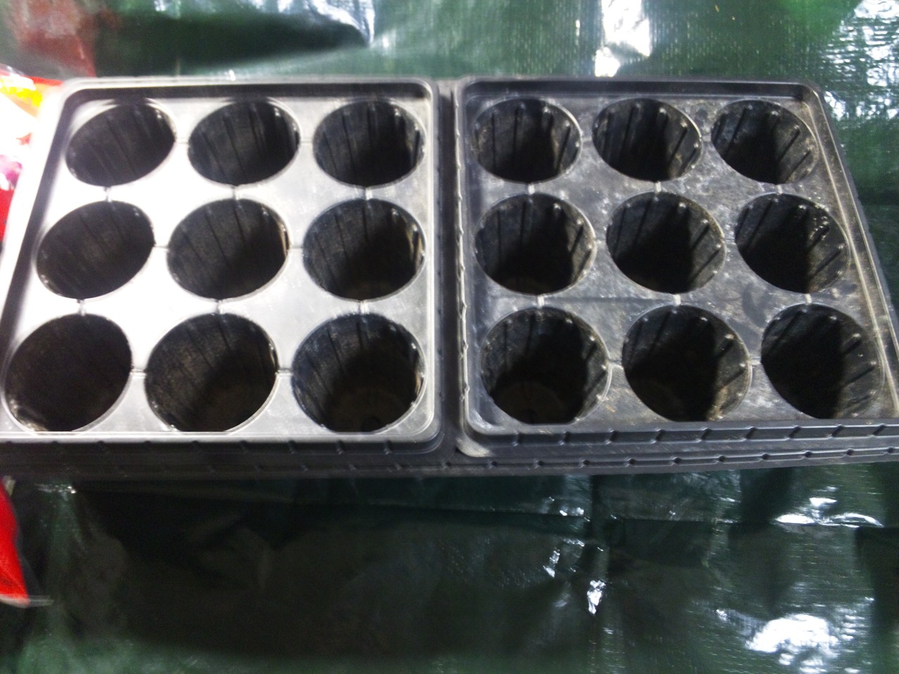 トレーに、正方形の、9つのポットがついているのが2つ。また、透明のカバーもついていて、温室栽培みたいなこともできる優れもの、の、使い回し(´・ω・`)