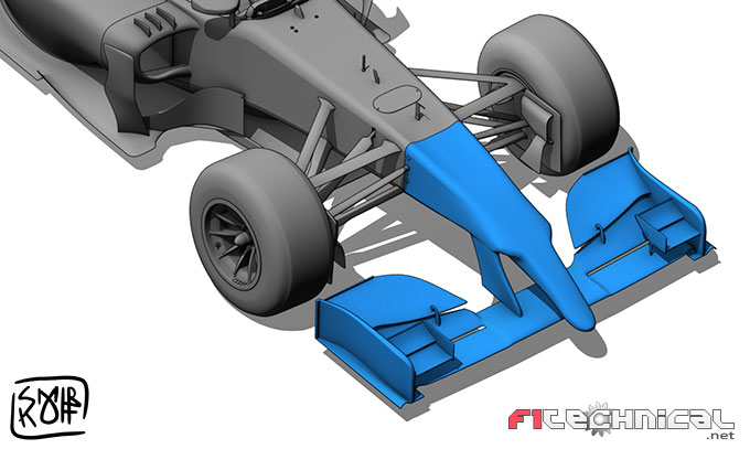 チームがどの方向を選ぼうと、ノーズ先端はフロント・ウィングに非常に近くなる。フロント・ウィングの最も高い面は、基準面から約120mmの点で約550mmあたりにある。これは、ノーズの下側を利用して、フロント・ウィングの中央部分の上とともに、ベンチュリ・チャネルを作り出すことができるかもしれない。効果がないとわかれば、ノーズコーンは、フロント・ウィングの20mm前まで延長するか、フロント・ウィングと40mmしか重ならない程度に短くすることもできる。後者の場合はかなり独特に見えるだろうが、前部衝撃テストに合格する短いノーズコーンを作るのは非常に難しい。