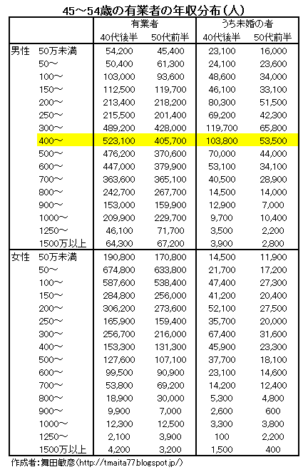 男性でみると年収400万円台が最も多いようですが,この層の40代後半の未婚率は19.8%,50代前半13.2%です。よって,この階層の男性の生涯未婚率は,両者を均して16.5%となります。年収400万円台の男性の場合,6人に1人が生涯未婚のままにとどまると見込まれるわけです。