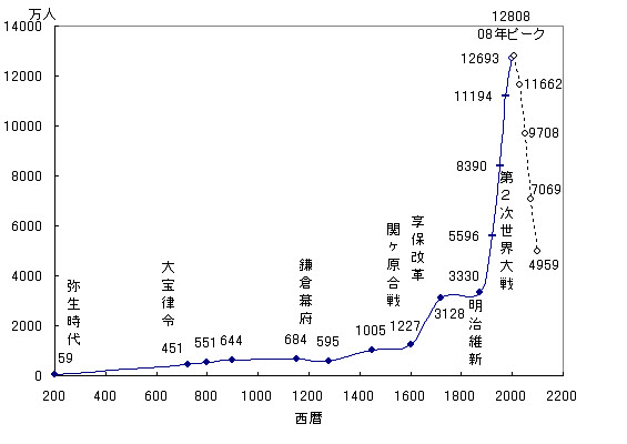 ーー漱石・鴎外の時代、多くの人が新聞小説を心待ちにして読んだのだなあ、当時どのくらいの読者数で、どのくらいの人口だったのだろう、と、漱石の『彼岸過迄』の冒頭を読んで、つまりしばらく新聞小説を休んでいた漱石の大患後のつぶやき、《自分の書くものを毎日日課のようにして読んでくれる読者の好意だのに、酬いなくてはすまないという心持がだいぶつけ加わって来る》などを読んで、すこし前調べてみたのだが、日本の人口推移はこんな具合だ。