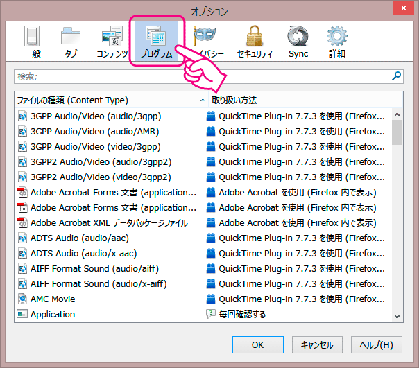 オプションの画面が表示されたら「プログラム」をクリックします。(画面はクリックした状態です)