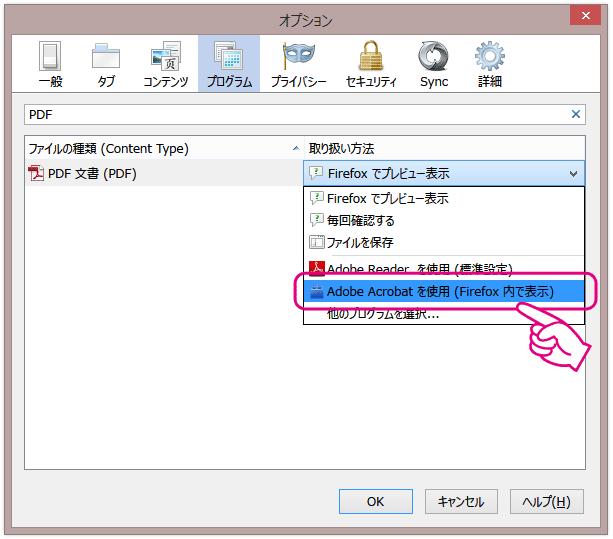 PDF文書の取り扱い方法で「Adobe Readerを使用」もしくは「Adobe Acrobatを使用」を選択します。