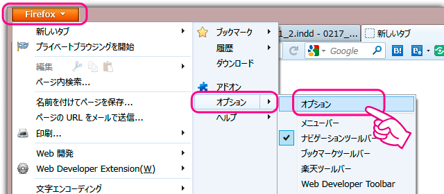 Firefoxのメニューから「オプション」→「オプション」を選択します。メニューバーを出している方は「ツール」→「オプション」を選択します。