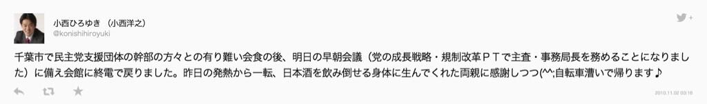 “@konishihiroyuki: 私は違法行為である自転車の飲酒運転は絶対に致しません。10月25日のツイートには「会合が終わりお酒が少し入っているので会館に自転車押して戻り中です。」と記させて頂いております。 http://t.co/H2Ll0nDNQ7