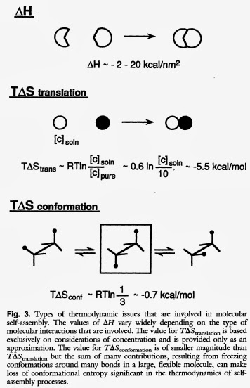 the values of 'H vary widely depending on the type of molecular interactions that are involved. The value for T'Stranslation is based exclusively on considerations of concentration and is provided only as an approximation. The value for T'Sconformation is of smaller magnitude than T'Stranslation but the sum of many contributions, resulting from freezing conformations around many bonds in a large, flexible molecule, can make loss of conformational entropy significant in the thermodynamics of self-assembly processes