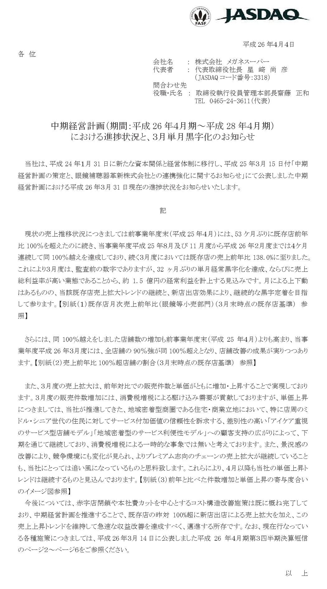 中期経営計画(期間:平成26年4月期~平成28年4月期)における進捗状況と、3月単月黒字化のお知らせ