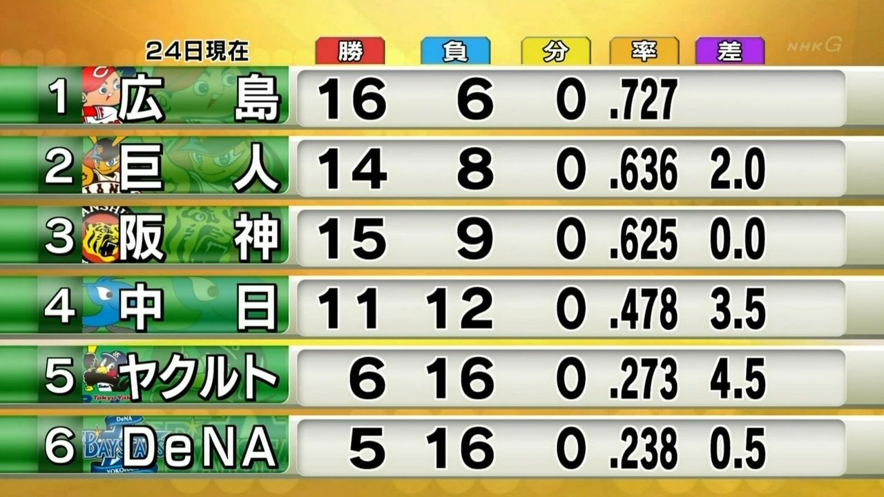 試合のなかったDeNAとゲーム差が縮まる