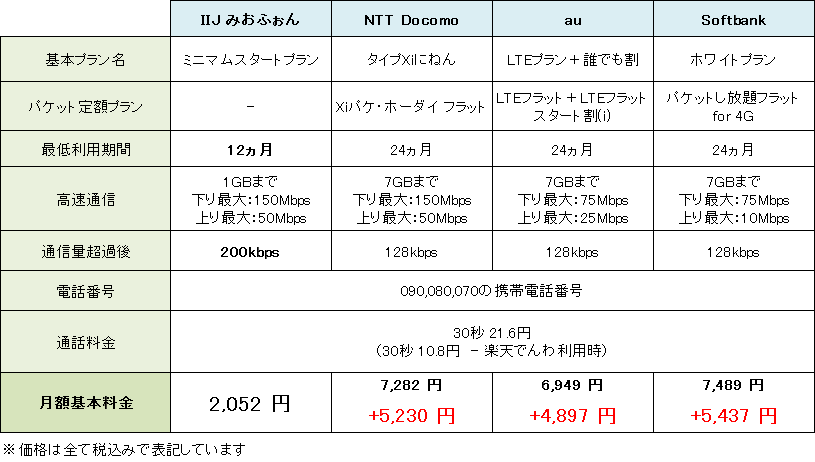 また携帯電話会社各社の料金プランと比較してみても約5,000円も差が出るなど、みおふぉんの価格はかなり魅力的。24ヶ月間毎月約2,300円ほど割引になる月々割などは考慮していませんが、それを引いても2,000円以上安いんですよね…!