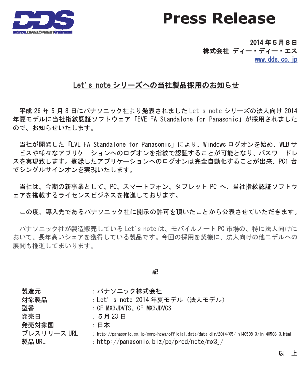 — RING (@xRINGx) 2014, 5月 8【DDS】平成26年5月8日にパナソニック社より発表されました、Let’s noteシリーズの法人向け2014年夏モデルに当社指紋認証ソフトウェア「EVE FA Standalone for Panasonic」が採用されましたので、お知らせいたします。