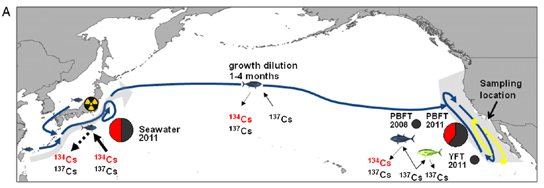 | 太平洋を西から東へ移動するクロマグロ(Pacific bluefin tuna)の回遊の概念図。 丸いグラフは、放射能汚染が確認された個体におけるセシウム同位体の内訳を示す。 赤がCs-134、黒がCs-137に対応。円の大きさは、セシウムの総量を表す。 矢印は新陳代謝の度合いを示す。(論文の図1Aより引用) |