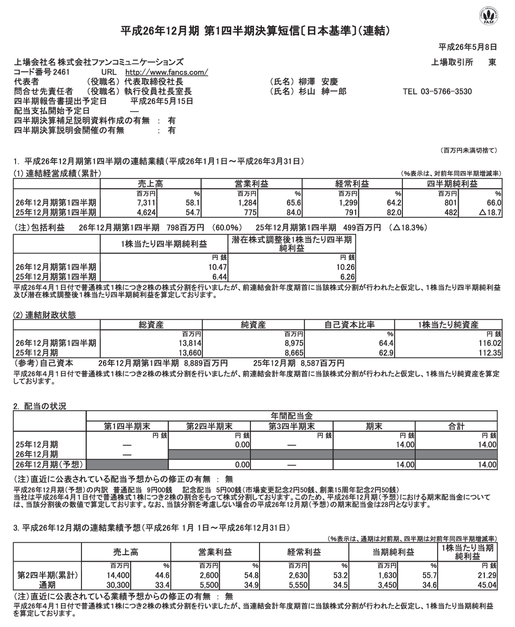 ファンコミ 平成26年12月期 第1四半期決算短信〔日本基準〕(連結)