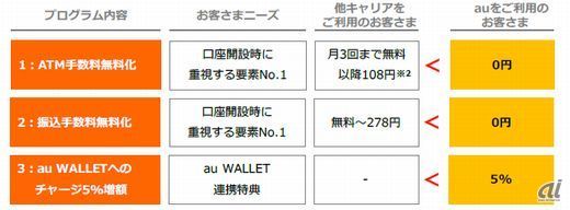 KDDIと三菱東京UFJ銀行が共同出資するネット銀行であるじぶん銀行は5月12日、au向けの口座特典プログラム「プレミアムバンク for au」を発表した。auユーザーであればATMの利用手数料や他行宛の振込手数料が回数無制限で無料になるサービスだ。