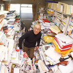 東京都世田谷区。静かな住宅街の相当に年季の入ったマンション内にあるという「岩田書院」に、社長兼ヒラ社員でもある岩田博を訪ねる。開きっぱなしの玄関ドアから中を覗いて、思わず絶句してしまった。靴を脱ぐわずか50センチ四方の先はどこまでも続く本の山で視界が遮られ、「どうぞ」という声はするが姿は見えない。どうしたら奥まで辿り着けるのか途方に暮れる。ところどころ低い山があって、そこを乗り越えながら進むしかないと覚悟を決め、本の山に突入する。どうやら原形は2Kの間取りらしいが、内部の構造が全くわからないほど本で覆い尽くされている。きっとここは廊下だったのだろう、ガス台だけが辛うじて見えるあの部分はキッチンか? うっかり手をつけば周囲の山から本雪崩が起きて埋まってしまう恐怖と戦いながら、障害物競走のような気分で進んで、やっと岩田を発見。毛糸の帽子に防寒ジャンパー。ほとんど外にいるのと同じいでたちで、猫の額も負けるわずかなスペースに座っていた。目の前は机のはずだが、本や資料に占領されて机上が消滅している。