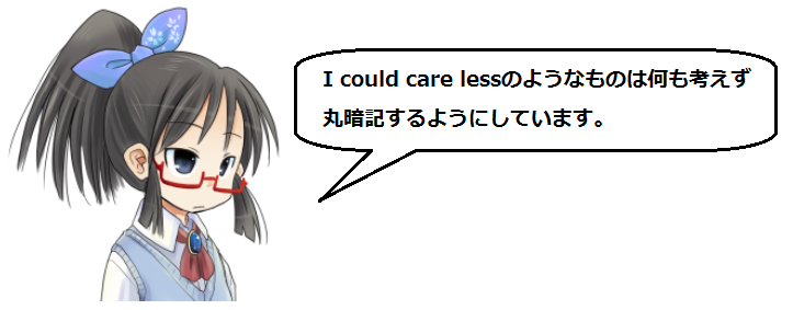↑それ皮肉的な言い回しだよ。「I COULD care less, but I don't(これ以上気にしないという事は出来るけど、そうしない)」っていうみたいな。