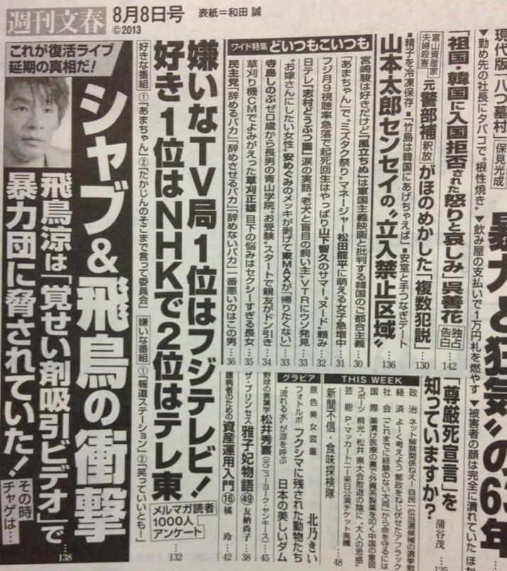 同誌が8月8日号で「シャブ&飛鳥の衝撃 飛鳥涼は『覚せい剤吸引ビデオ』で 暴力団に脅されていた!」と報じて以来、初めてのメディアへの登場となる。
